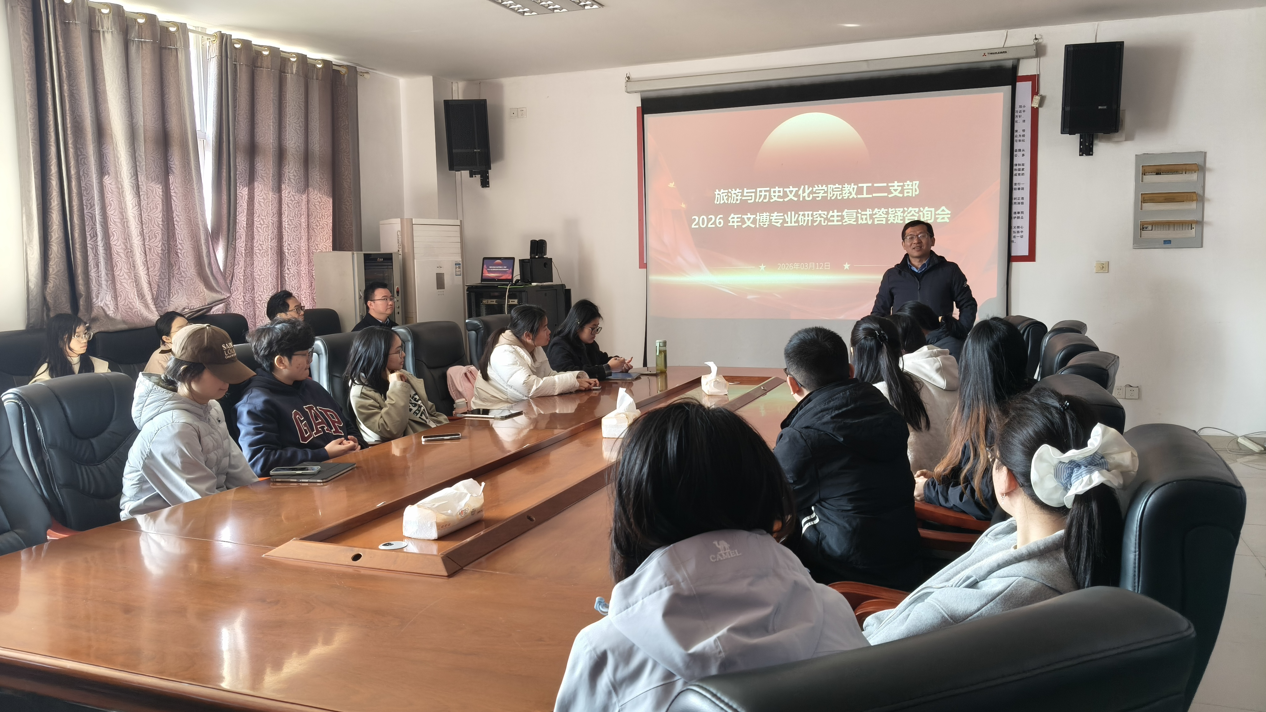 为助力我院文博专业考生从容应对2026年研究生复试, 3月12日上午,旅游与历史文化学院教工第二党支部举办了一场别开生面的研究生复试答疑咨询会。本次会议是学院教工第二党支部“树立和践行正确政绩观学习教育”的一项具体举措,由教工第二党支部书记彭志军主持。学院院长习罡华、副院长彭志才、二支部部分党员教师参会。本次答疑咨询会为学院40多名文博专业考研初试上线的本科生全方位解读了复试要点,提供了实用备考策略。会议伊始,...
