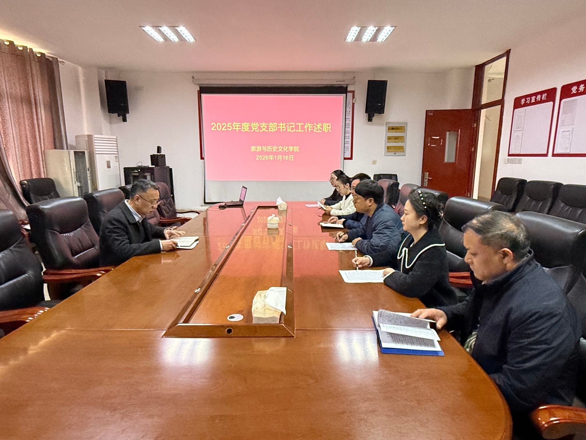 为进一步压实党支部书记抓基层党建第一责任人职责,强化管党治党政治担当,推动全面从严治党向基层延伸、向纵深发展,1月16日,旅游与历史文化学院召开2025年度党支部书记工作述职评议会。学院党委书记秦著红主持并讲话。本次述职采取“现场述职+书面述职”相结合的方式开展。会上,学院六个党支部书记石银华、彭志军、金璐洁、余谅、勒立、康颖菲分别围绕2025年度党建工作履职情况,重点从年度工作成效与特色亮点、存在的问题及原因分析、...
