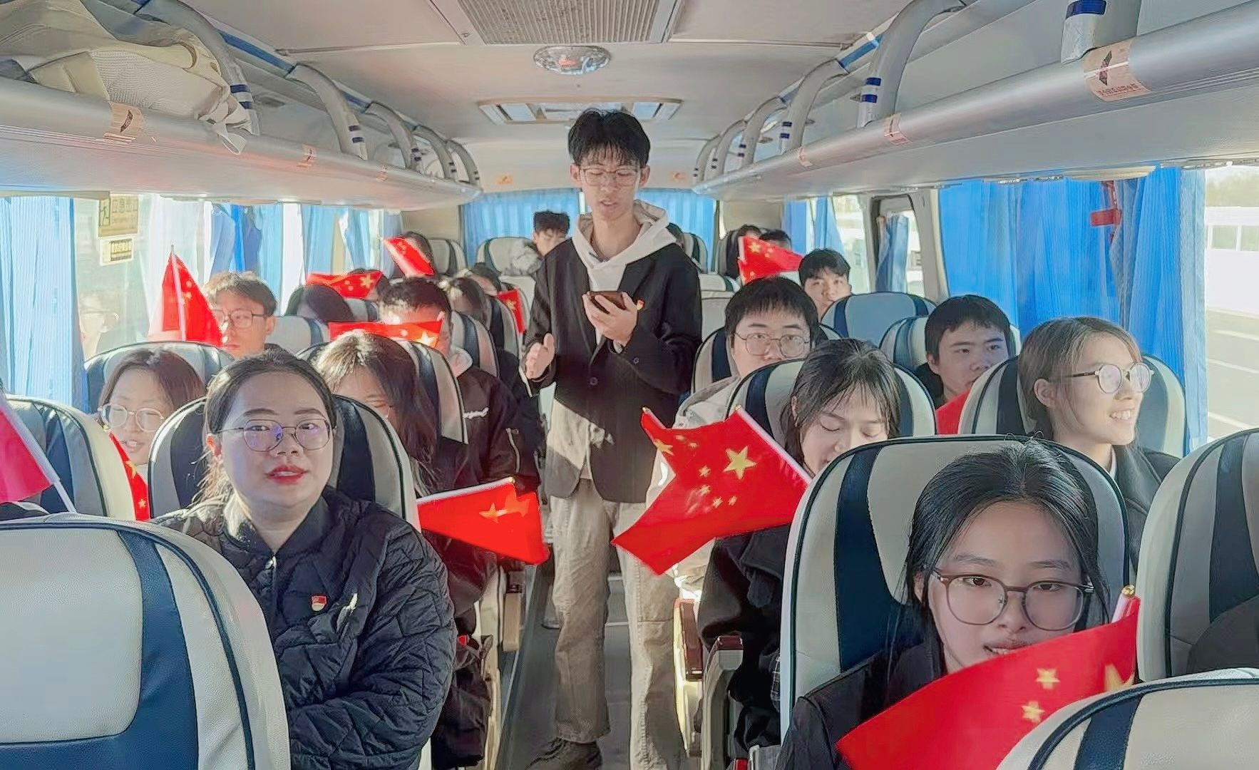 在前往纪念园的车上,师生党员挥动国旗,齐声高唱《歌唱祖国》《我和我的祖国》《团结就是力量》《没有共产党就没有新中国》等红色歌曲,嘹亮的歌声表达了对党和祖国的无限热爱。