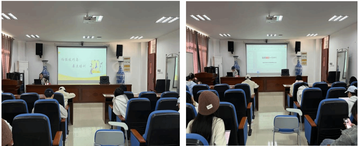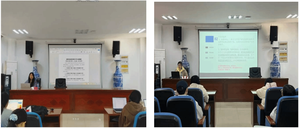 在PPT培训环节中,江飞宾从封面设计、页面排版、配图逻辑、色彩搭配与动画设置等方面进行了系统梳理。他明确提出,高质量的 PPT 应具备风格统一、逻辑清晰、内容精炼、视觉舒适等特点,并结合优秀与不足作品的对比,为同学们展示了制作思路与改进方向,现场示范进一步提升了培训的实践性和针对性。