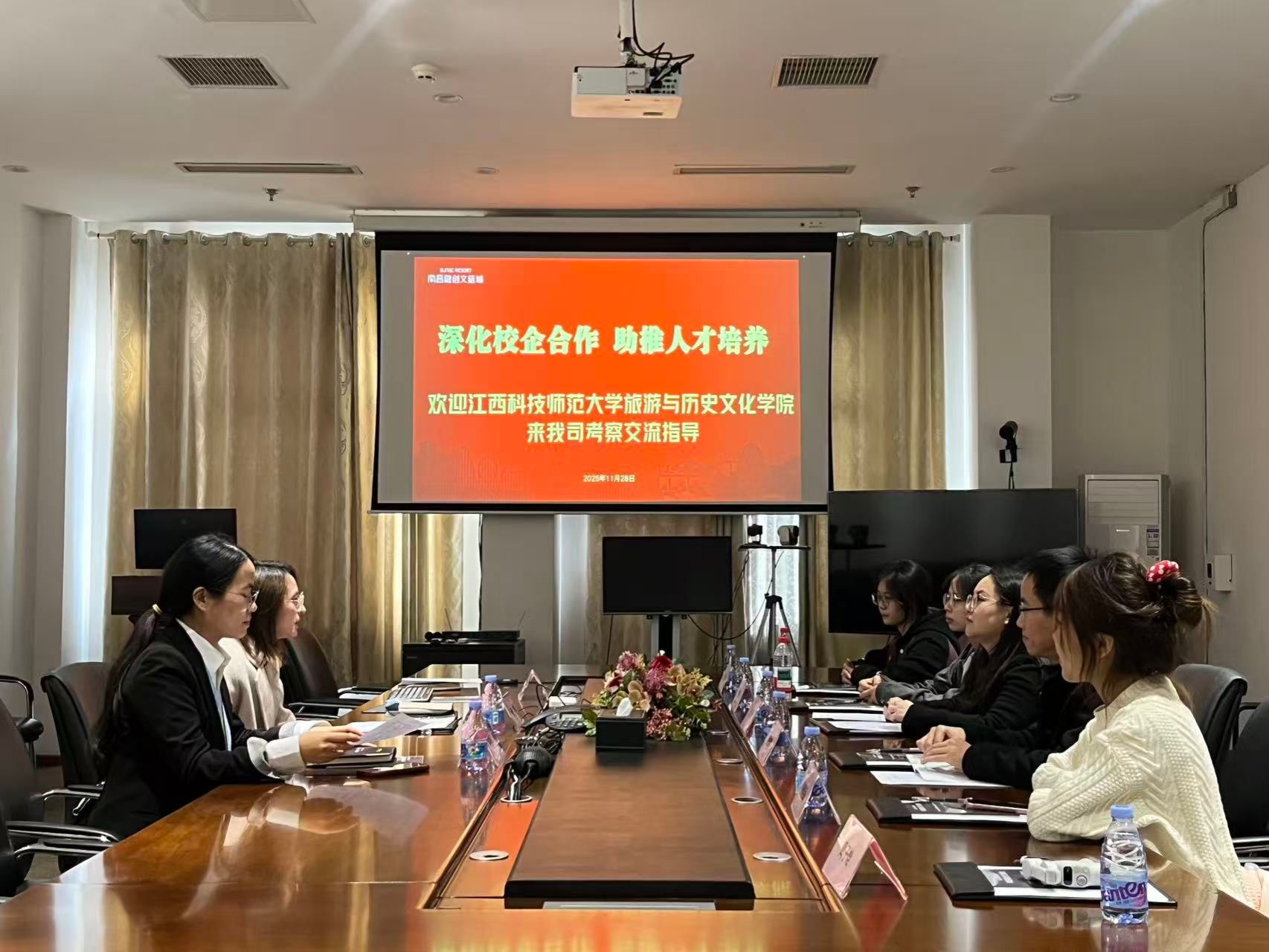 为进一步拓展就业渠道、强化校企协同育人机制,11月28日,旅游与历史文化学院旅游管理专业系主任杨帆、博士蔡振饶带领3位毕业生赴南昌融创主题文化旅游管理有限公司开展访企拓岗专项行动,该公司总经理李婧热情接待并参加座谈。