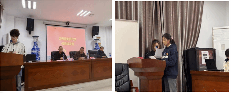 优秀运动员代表何祖祥、吕钰欣依次发言,结合自身参赛经历分享体会,阐述了体育运动在调节身心状态、助力学业发展中的积极作用,号召全体同学将运动融入日常,养成科学锻炼、持之以恒的良好习惯。