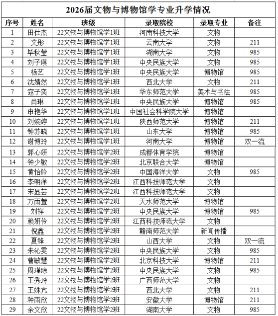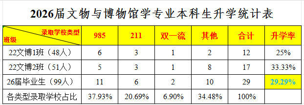 分享会伊始,通报了今年文物与博物馆学专业升学情况。2026届文物与博物馆学专业本科生共计99人,其中,29名同学成功升学,升学率为29.3%,其中11名学子圆梦山东大学、湖南大学、中央民族大学、中国海洋大学等985高校,占升学总人数的38%,较去年提升6个百分点;更有学子斩获外语90分的优异成绩,实现外语单科历史性突破。这份成绩,既是文博学子深耕不辍、潜心向学的汗水结晶,也是学院深耕专业教育、聚力拔尖人才培养的生动见证,彰显出文博系在挑战中坚守、在承压中奋进的育人底气与专业实力。