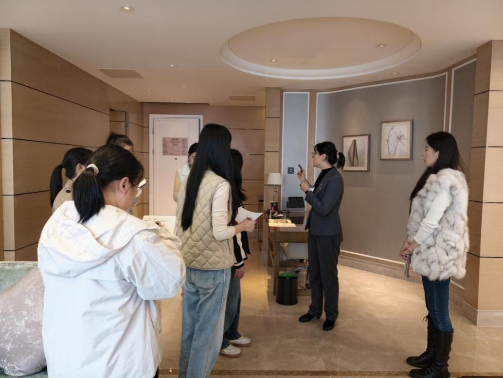 在酒店的周密安排下,同学们有序参观了宴会厅、客房、餐饮、后勤等核心运营部门。通过实地观察与现场交流,大家将课堂理论同行业实际相结合,对高端酒店服务管理的运作标准和管理特点有了更直观的认识。