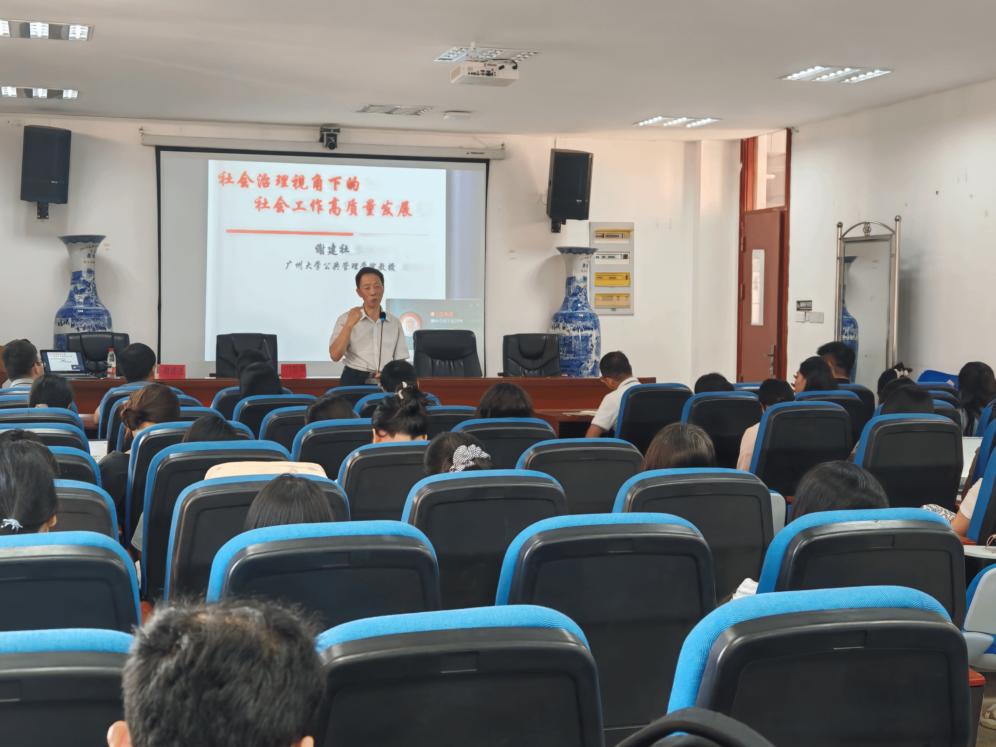 下午,在新文科楼W2317教室举办学院“紫荆讲坛(第 3 期)”,由谢建社以“社会治理视角下的社会工作高质量发展”为题开讲,全院师生60余人参与。