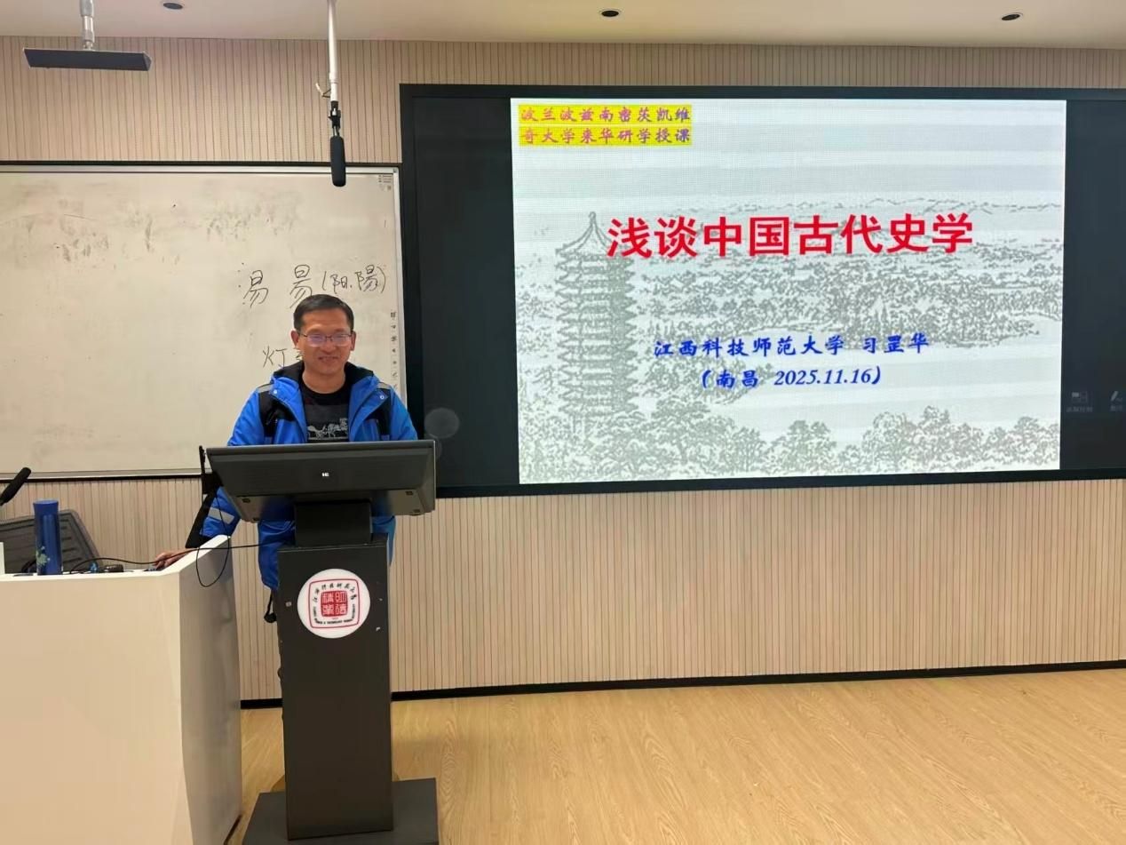 冬日南昌,寒意渐浓,而中波文化交流却暖意融融。11月18日晚,在文科楼W1409教室,旅游与历史文化学院院长习罡华教授以“浅谈中国古代史学”为题,为波兰波兹南密茨凯维奇大学访华研学团同学进行了一场授课,用文化的温度点亮异国学子探索中华文明的精神之旅。